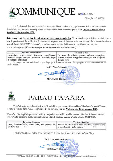 Le président de la communauté de communes de Hava'i informe la population de Tahaa qu'une collecte des déchets encombrants sera organisée sur l'ensemble de la commune prévu pour Lundi 24 novembre au Vendredi 28 novembre 2025.